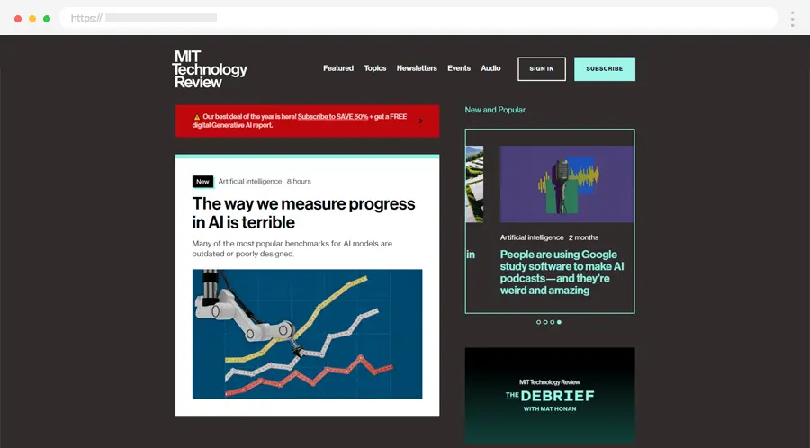 MIT Technology Review detaljno analizira tehnološke inovacije i nudi stručne, vizionarske uvide. Čist dizajn pomaže fokusu na revolucionarne ideje.