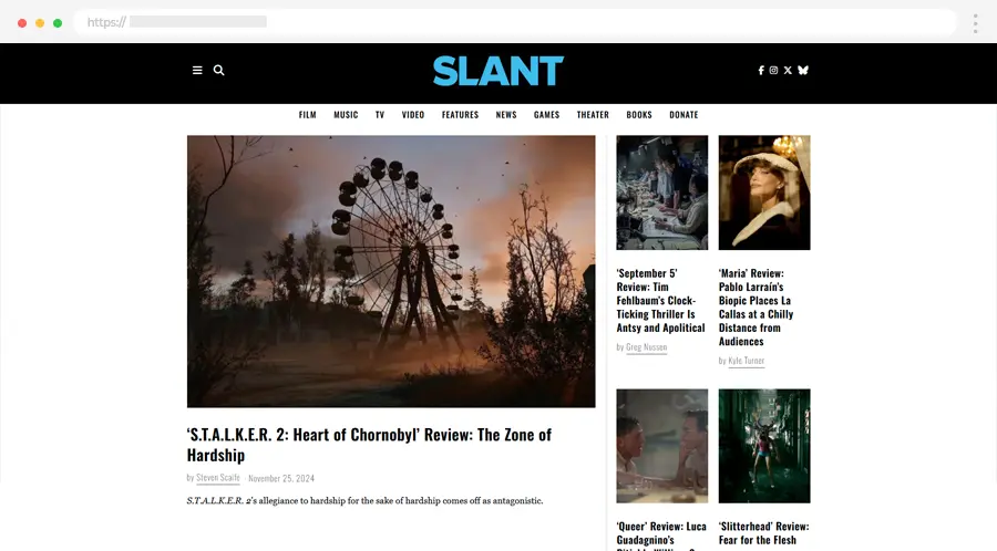 Slant donosi kritičke osvrte na filmove, TV serije i muziku. Moderan i oštar dizajn čini ga idealnim izvorom za ljubitelje zabave koji traže argumentovana mišljenja.