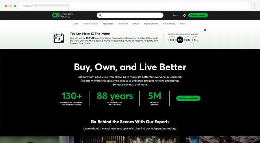 Consumer Reports je pouzdan izvor nepristrasnih recenzija proizvoda i vodiča za kupovinu. Funkcionalan dizajn omogućava brzo pronalaženje korisnih informacija.