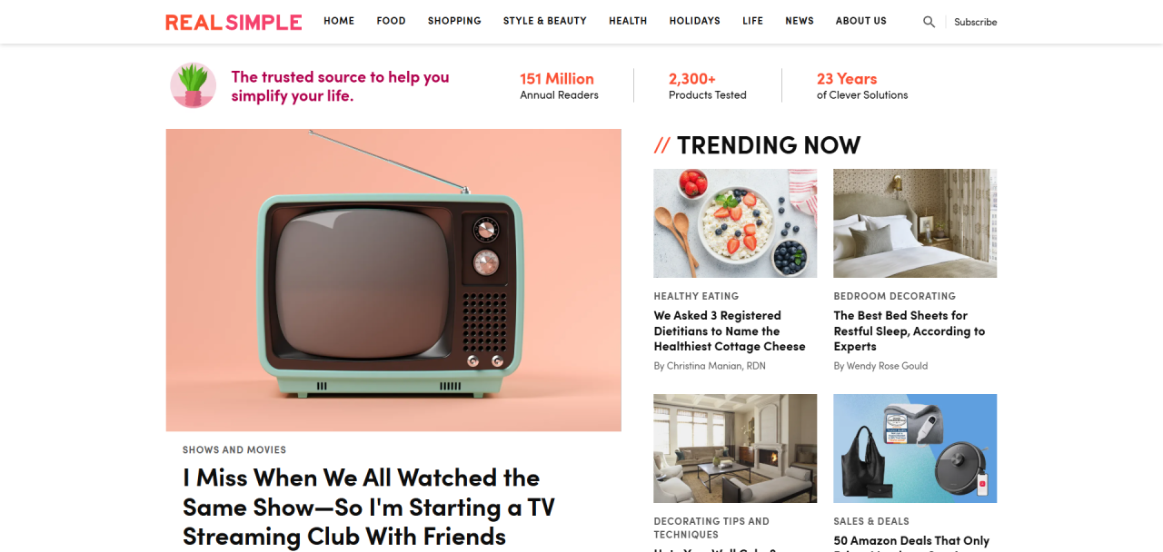 Real Simple nudi praktična rešenja za svakodnevne izazove — od organizacije doma do pripreme obroka. Smiren dizajn olakšava snalaženje kroz savete i vodiče.