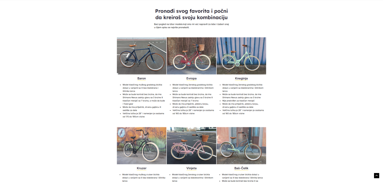 - Navigacija je jednostavna — posetilac odmah zna gde može da pogleda katalog, kako da pokrene opciju "Kreiraj svoj bicikl" i kako da se obrati timu.